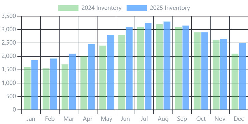 Caption: 2025 saw a noticeable spike in inventory (blue bars) compared to 2024 (green bars), yet prices held firm.