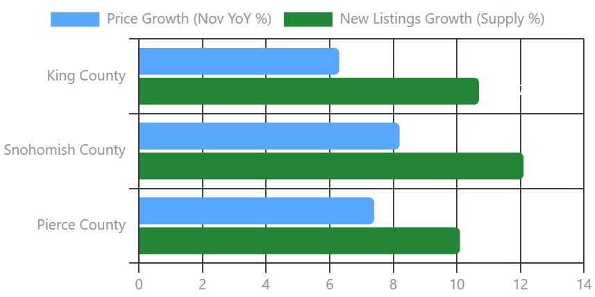 Contrary to early fears, Snohomish County did not falter; it surged. The data shows it achieved the highest year-over-year price growth in the region at approximately 8.2%, despite also having the highest growth in new listings.
