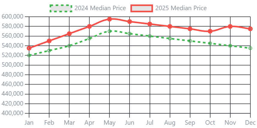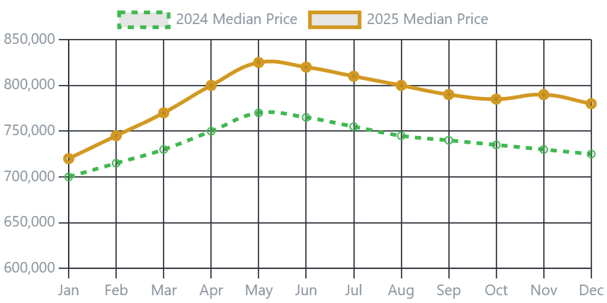 Caption: The 2025 median price curve (gold line) for Snohomish County consistently stayed well above the 2024 trend (dotted green line), illustrating a strong rebound.