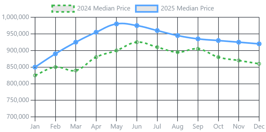 Caption: King County median prices (blue line) remained resilient, consistently outperforming 2024 levels with a peak near $980k.